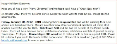 If you are holding tickets to the IBDI New Years Dance at the Pacific Beach Hotel for this coming Saturday, you gotta be the lucky ones. I'm not sure if there are anymore tickets floating around at this late date but you can try contact any IBDI member. If not successful, then there is still time to get on board for the IBDI Inaugural Ball at the Pacific Beach on January 20, 2012. Scan over Lynn Nakamura's e-mail that follows or bettah yet...contact her for tickets.............